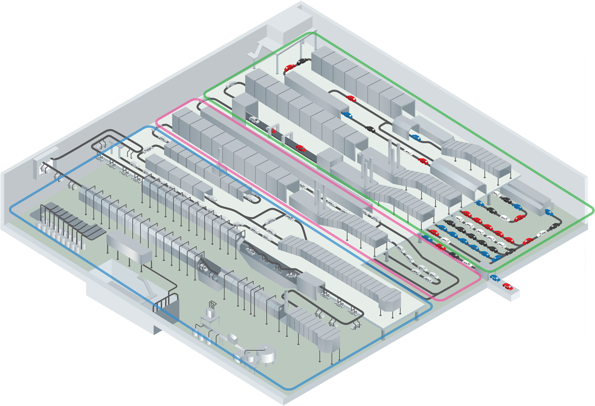塗装工場の心臓と血管にあたる塗料供給システムです。水性・溶剤等各塗料に合わせた最適なシステムで、塗料を塗装工程に供給します。