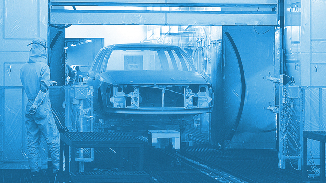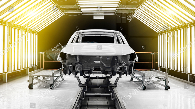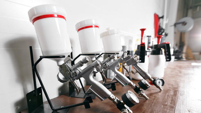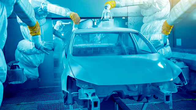 スプレーガンで塗料を吹き付ける行程で、最近では塗装ロボットによりほとんど自動化されています。中塗・ベース・上塗・クリアと塗装を繰返し行います。塗装ブースは外部の環境から遮閉し、空調装置から送られた湿度・温度管理されたエアーによりクリーンルームにて最適な環境下で塗装を行い、排出ガス等環境にも配慮されています。
