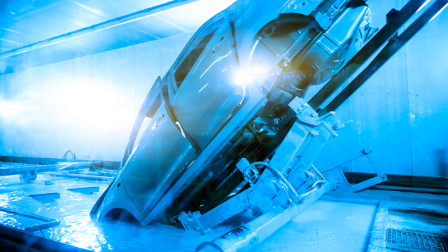 車体工場から送られたボディーには、プレス・溶接時の油や鉄粉などが付着しています。そのまま塗装すると塗膜の剥離を起こします。そのため、十分に洗浄し皮膜化成を行い、防錆力を向上させる行程です。
